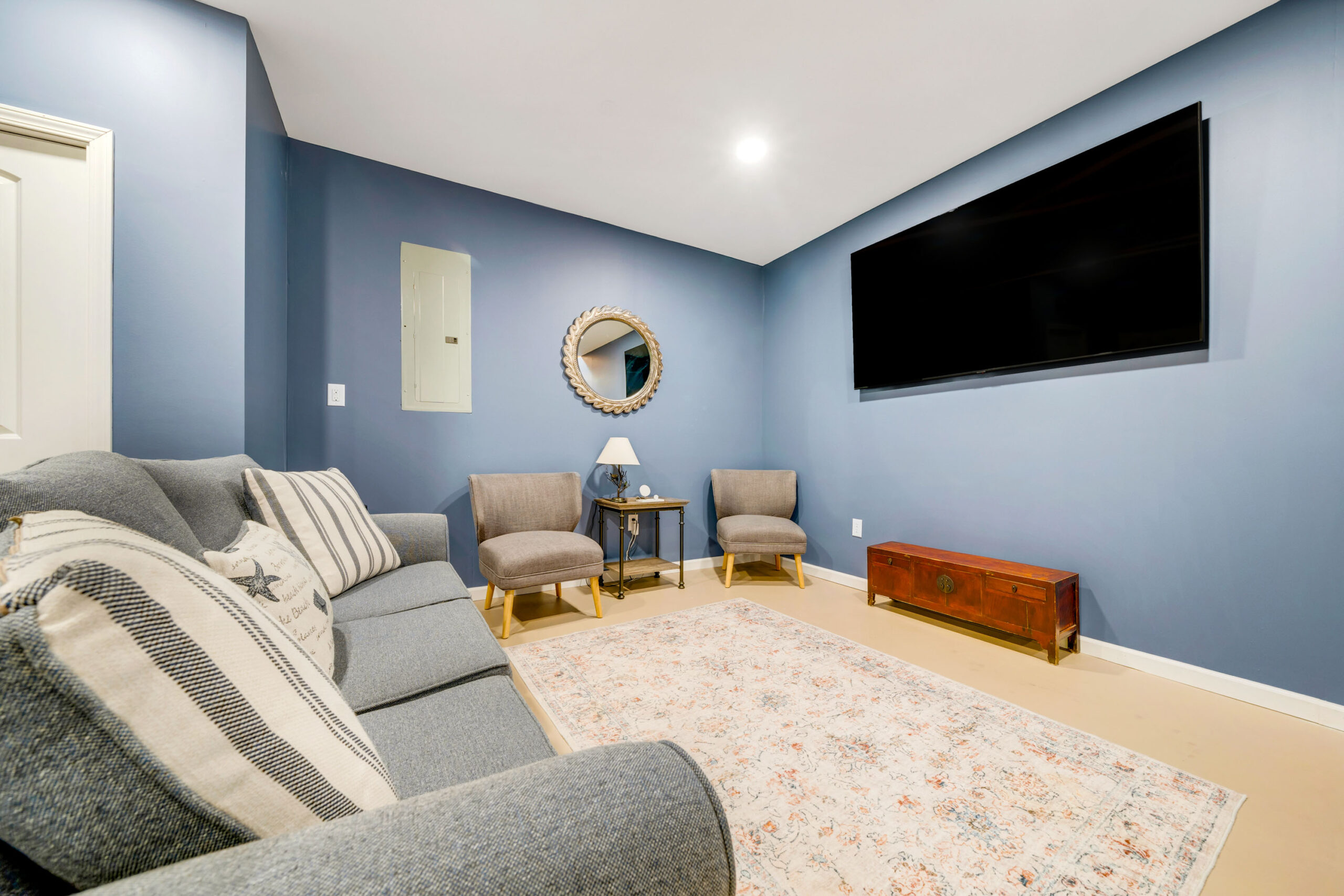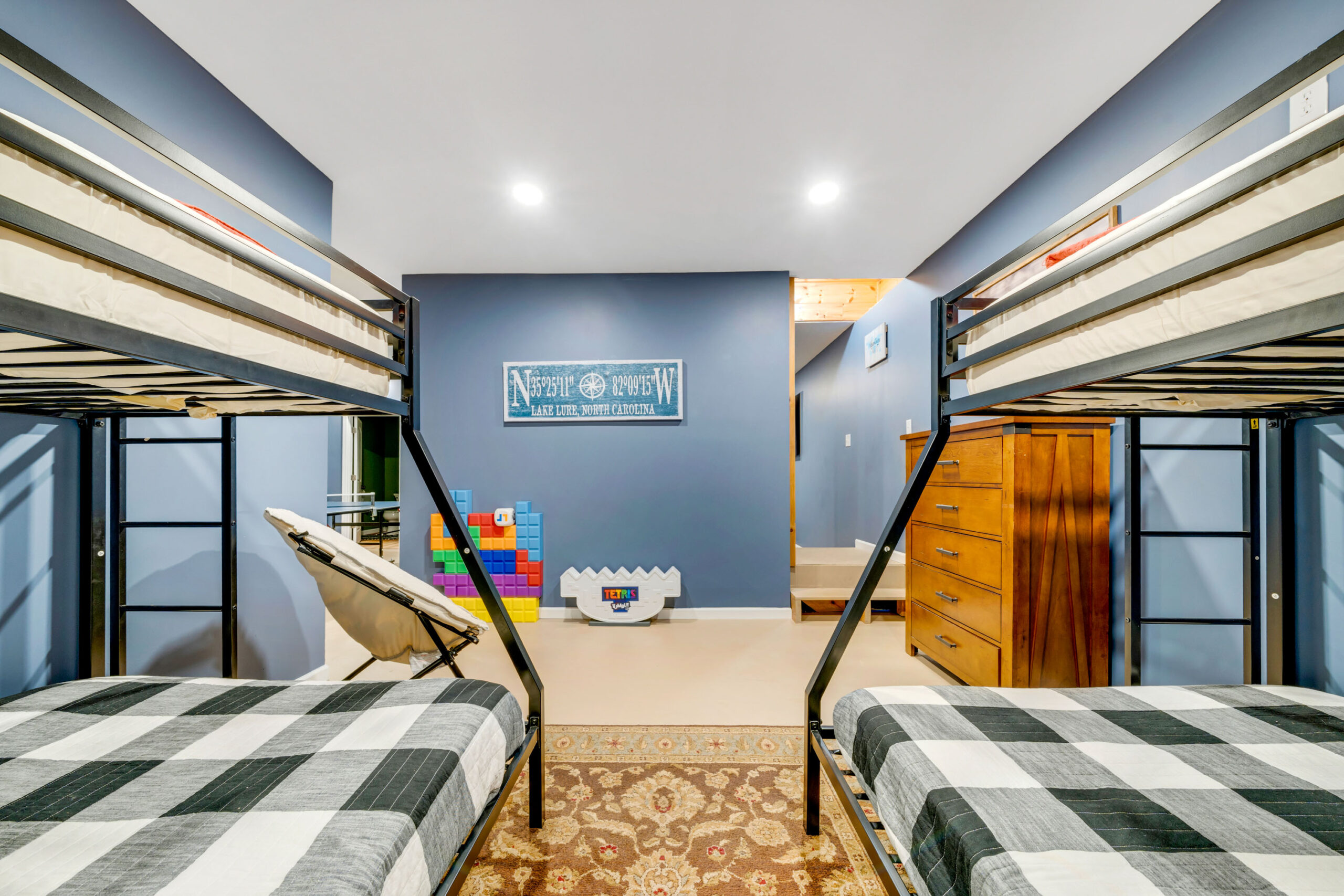 Located in the basement of the cabin, this spacious room boasts a queen size bedroom and is next to the double bunkbed area. This room has plenty of storage areas, smart tv and easy access to to game room and lounge area with pull out sofa.